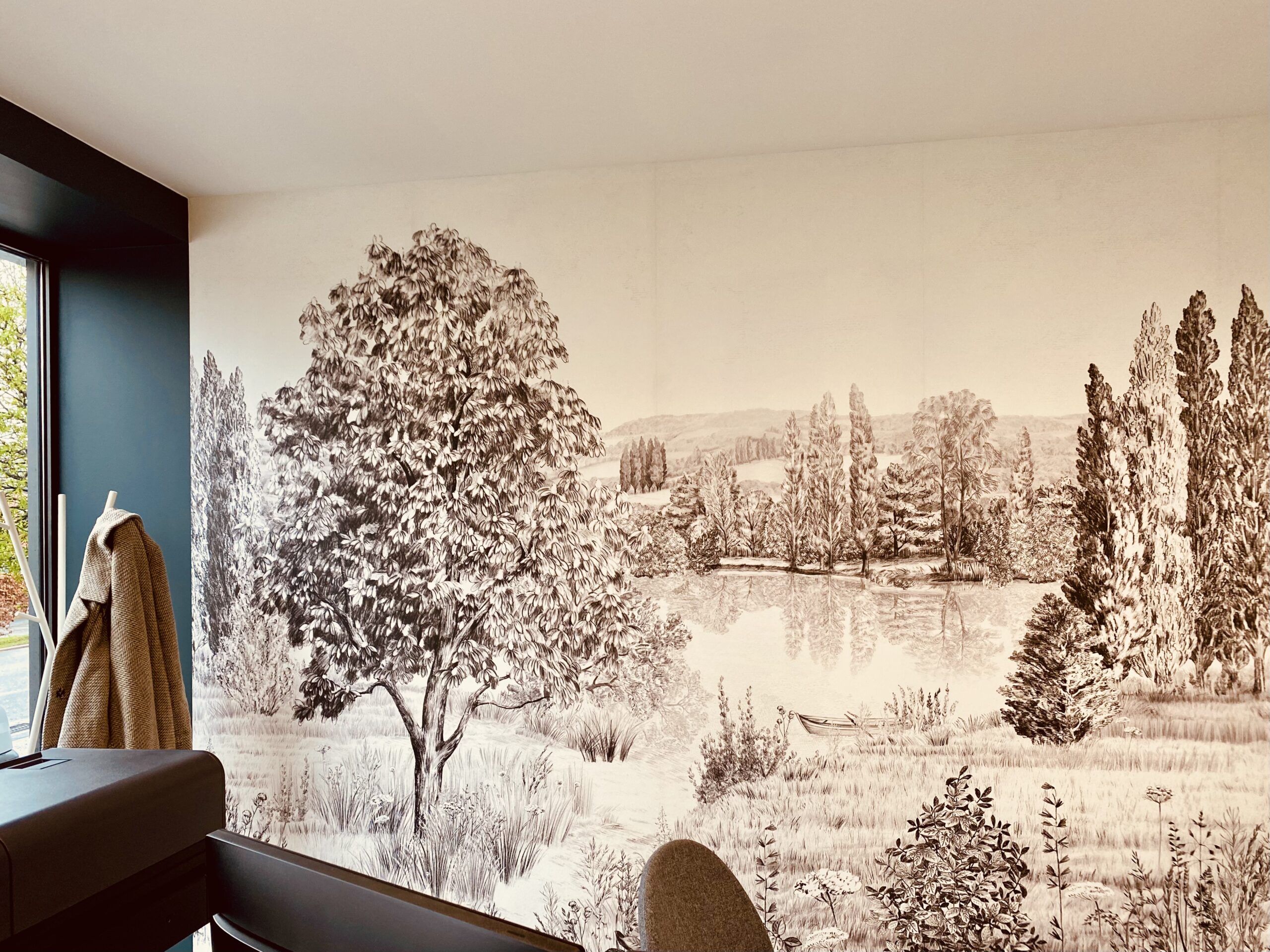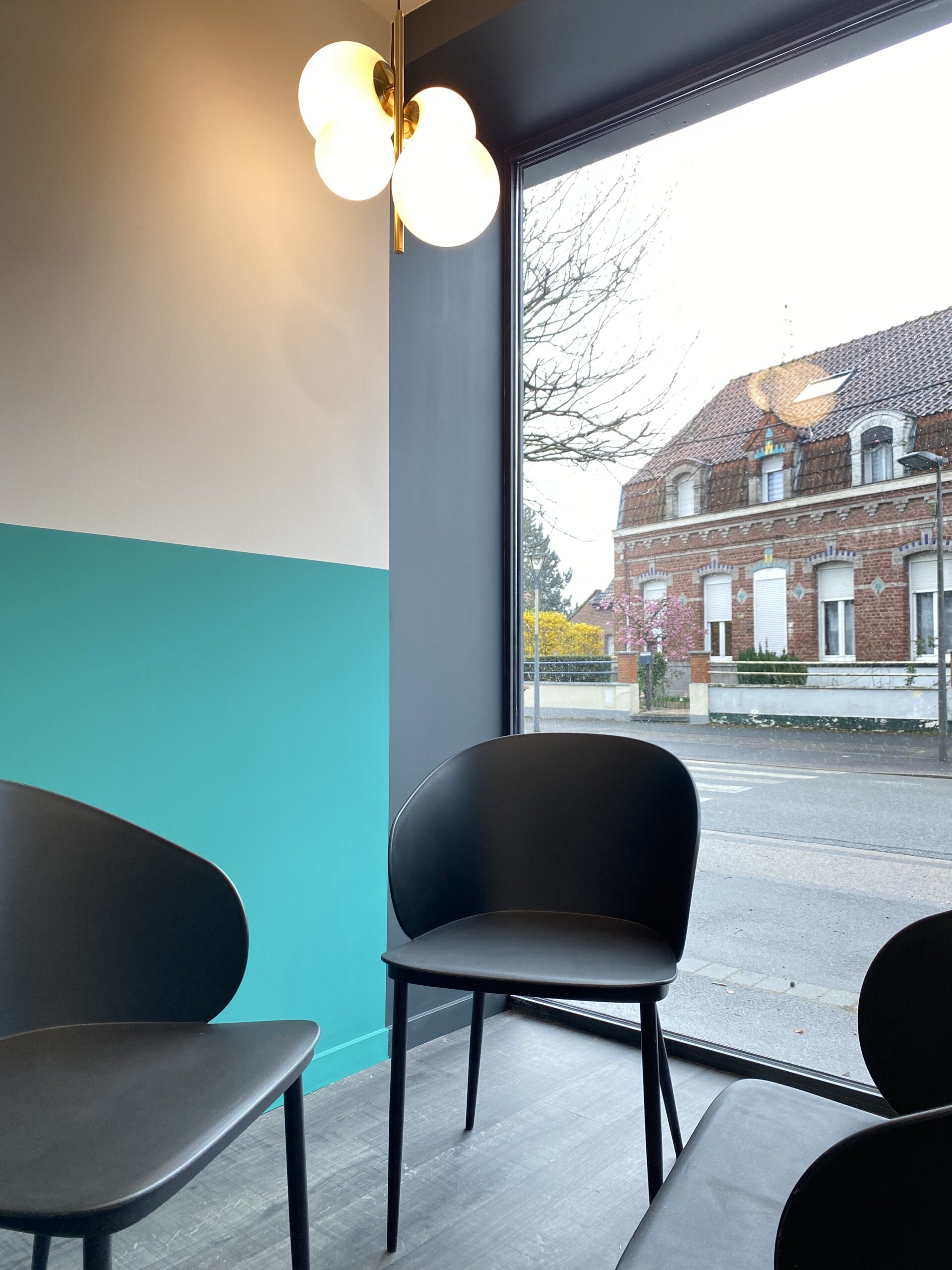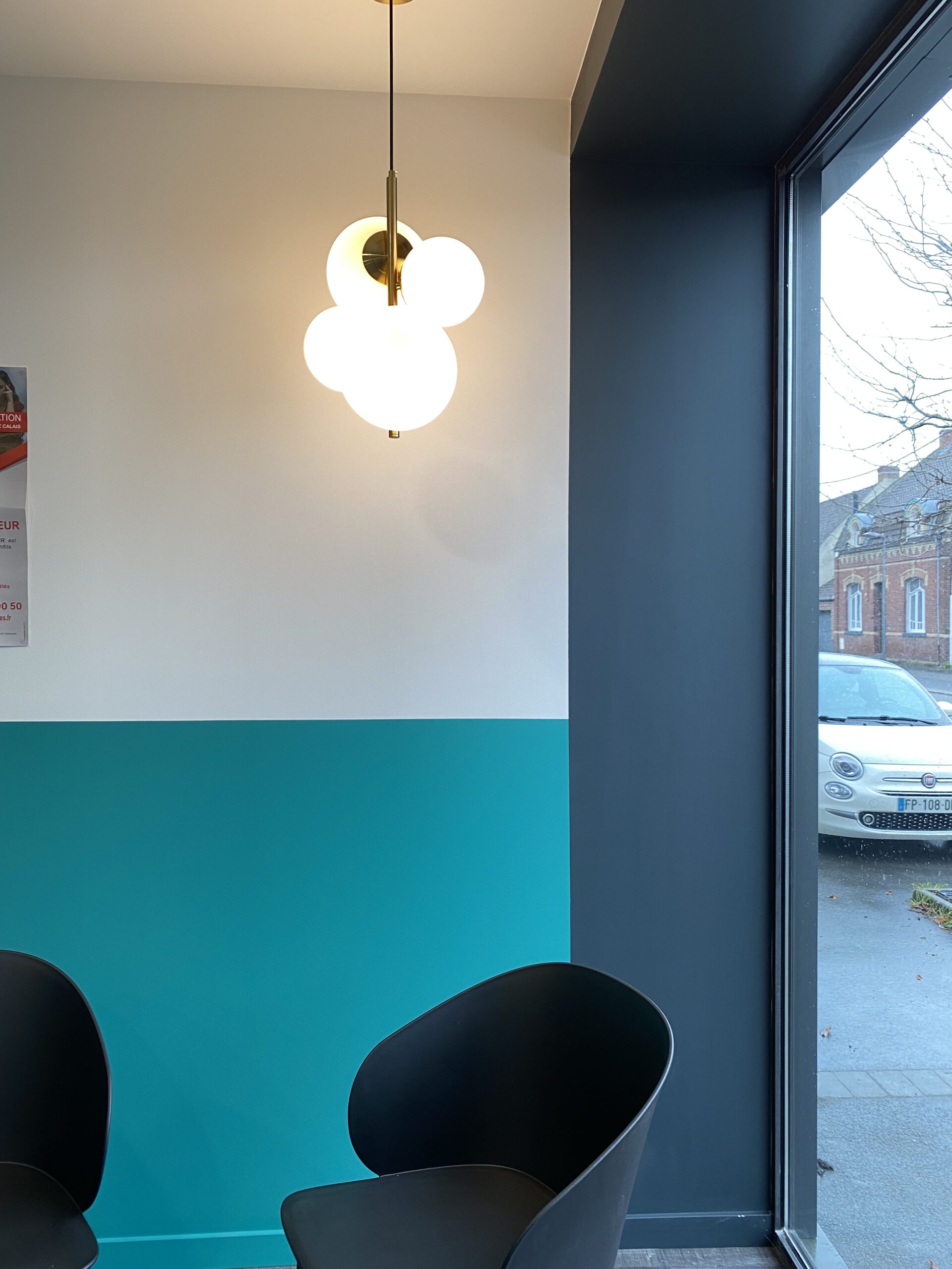 Côté deco: Rapidement, l’idée s’impose de tisser un lien avec le passé du local. Les carreaux céramique de la façade ont orienté le choix d’une palette chromatique mêlant vert profond et bleu, ponctuée de touches de noir pour une esthétique chic et graphique. Les luminaires tout en rondeur apportent une douceur équilibrante tandis qu’un papier peint à motif végétal, placé dans l’espace d’accueil, rend hommage à l’histoire horticole du lieu.