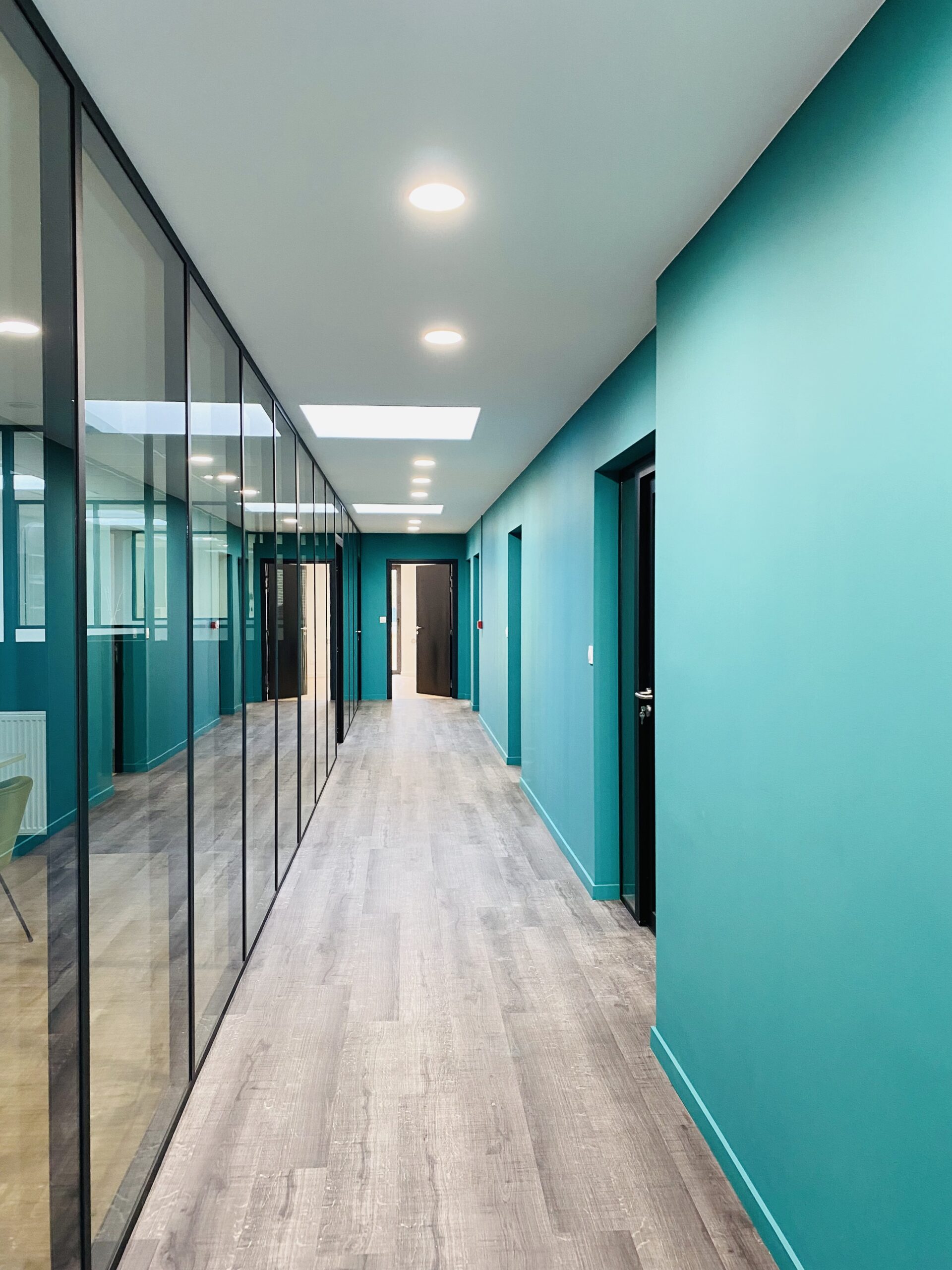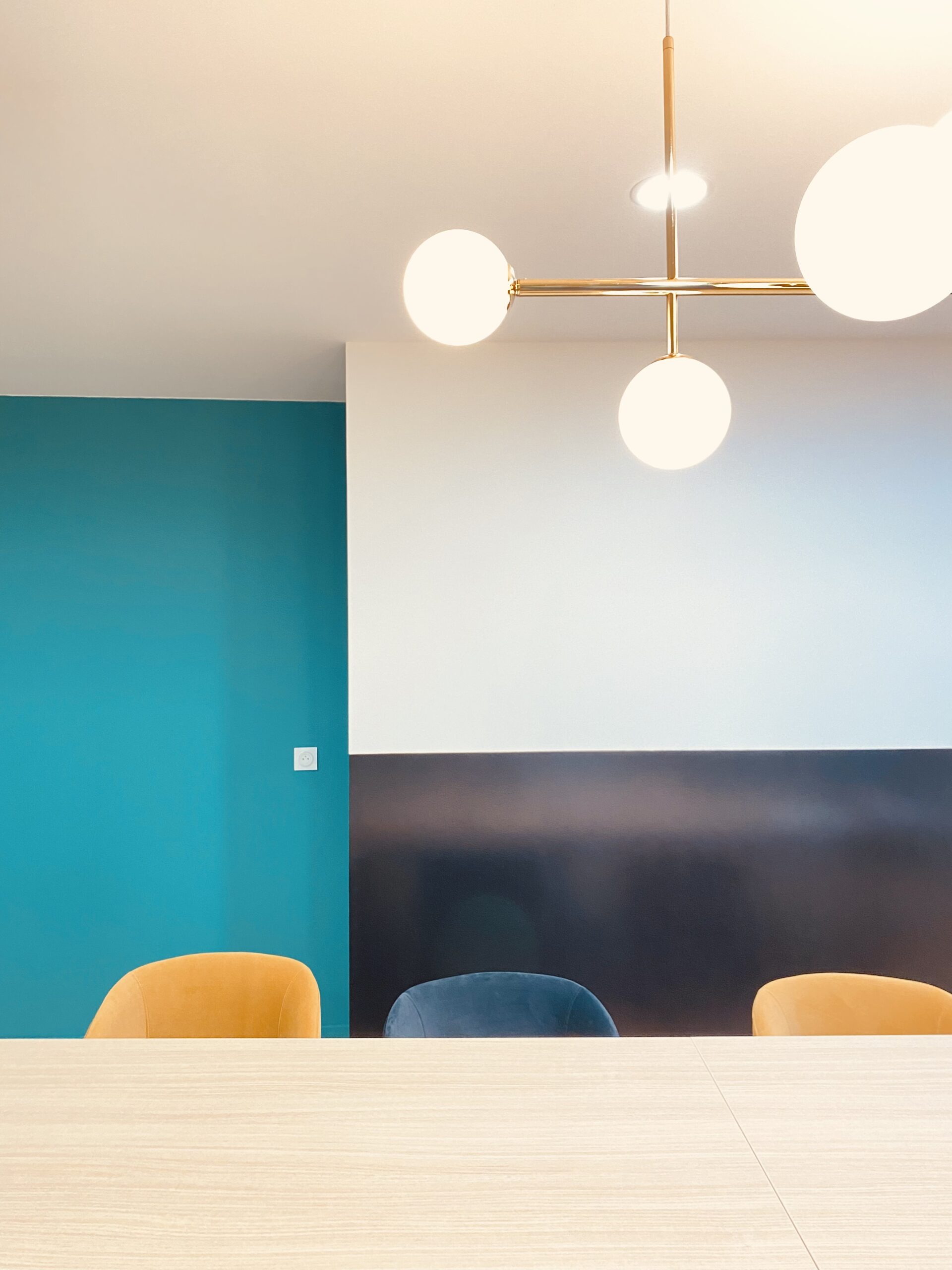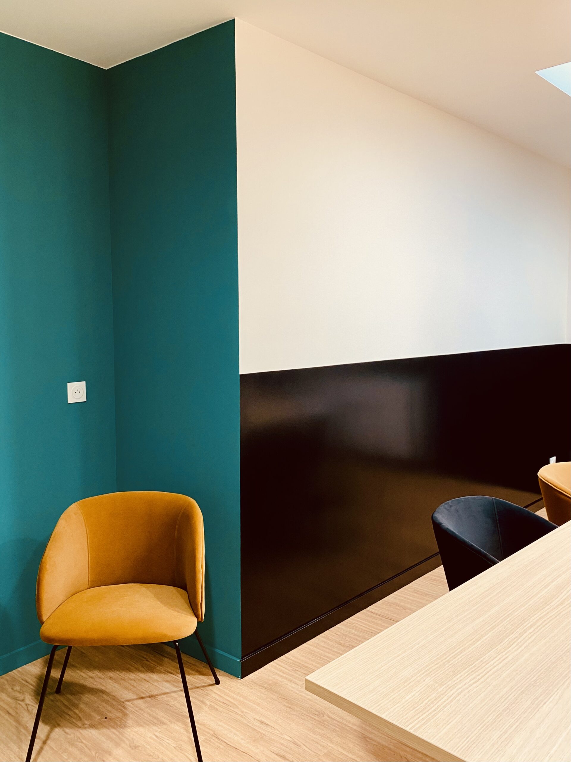 Point fort: La transformation réussie d’un bâtiment désuet en un espace de travail élégant et fonctionnel. Un accompagnement sur-mesure qui répond aux attentes de ma cliente, depuis la gestion des aspects réglementaires (dépôt de permis, normes ERP, dossier accessibilité et incendie) jusqu’à la sélection minutieuse des matériaux, des couleurs et du mobilier.