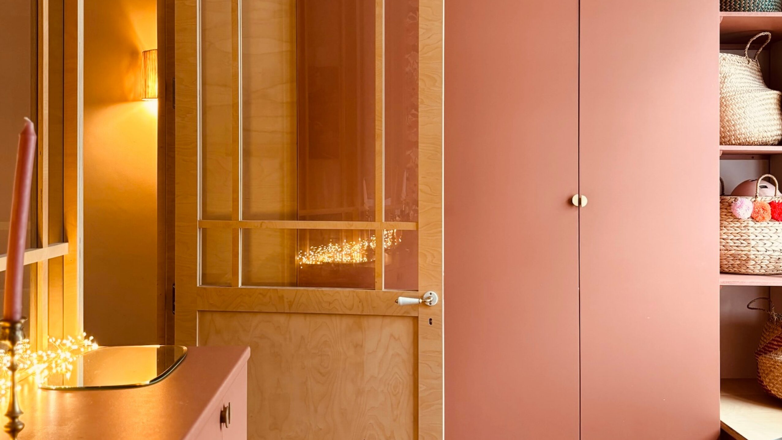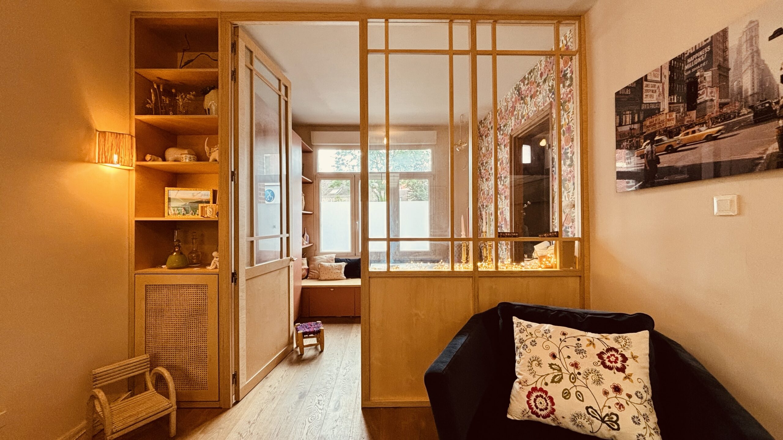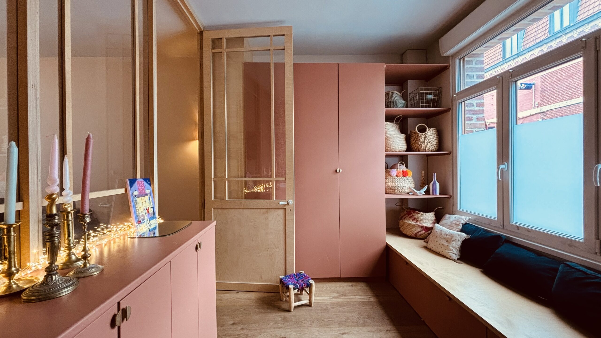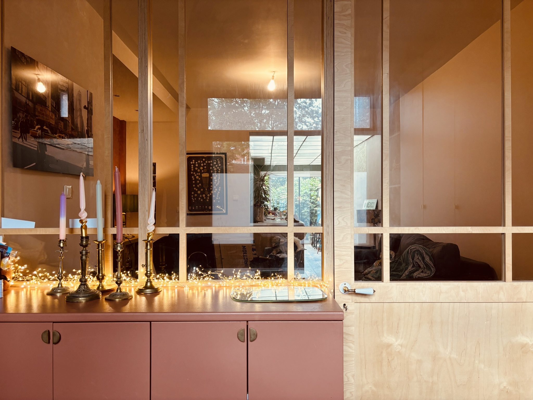 Côté déco, l’ambiance colorée est assumée pour faire de ce petit espace un écrin. La couleur Terracotta qui habille les placards est rehaussée par un papier peint fleuri, le tout adouci par la teinte lumineuse du contreplaqué de bouleau choisi pour la verrière.