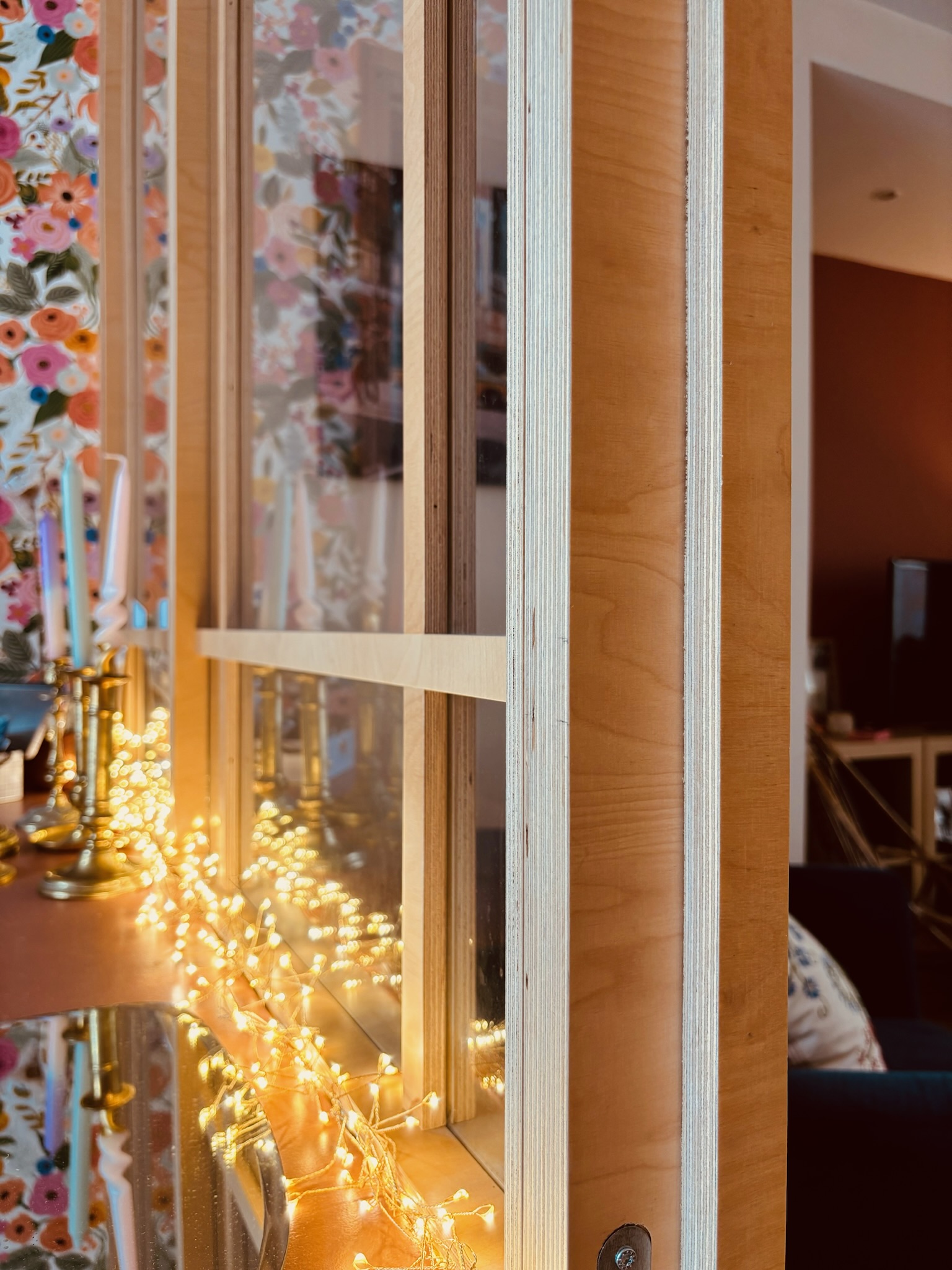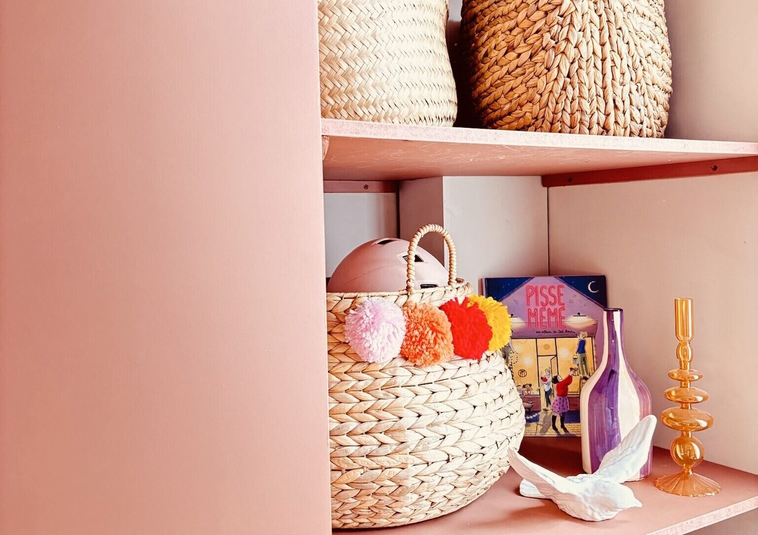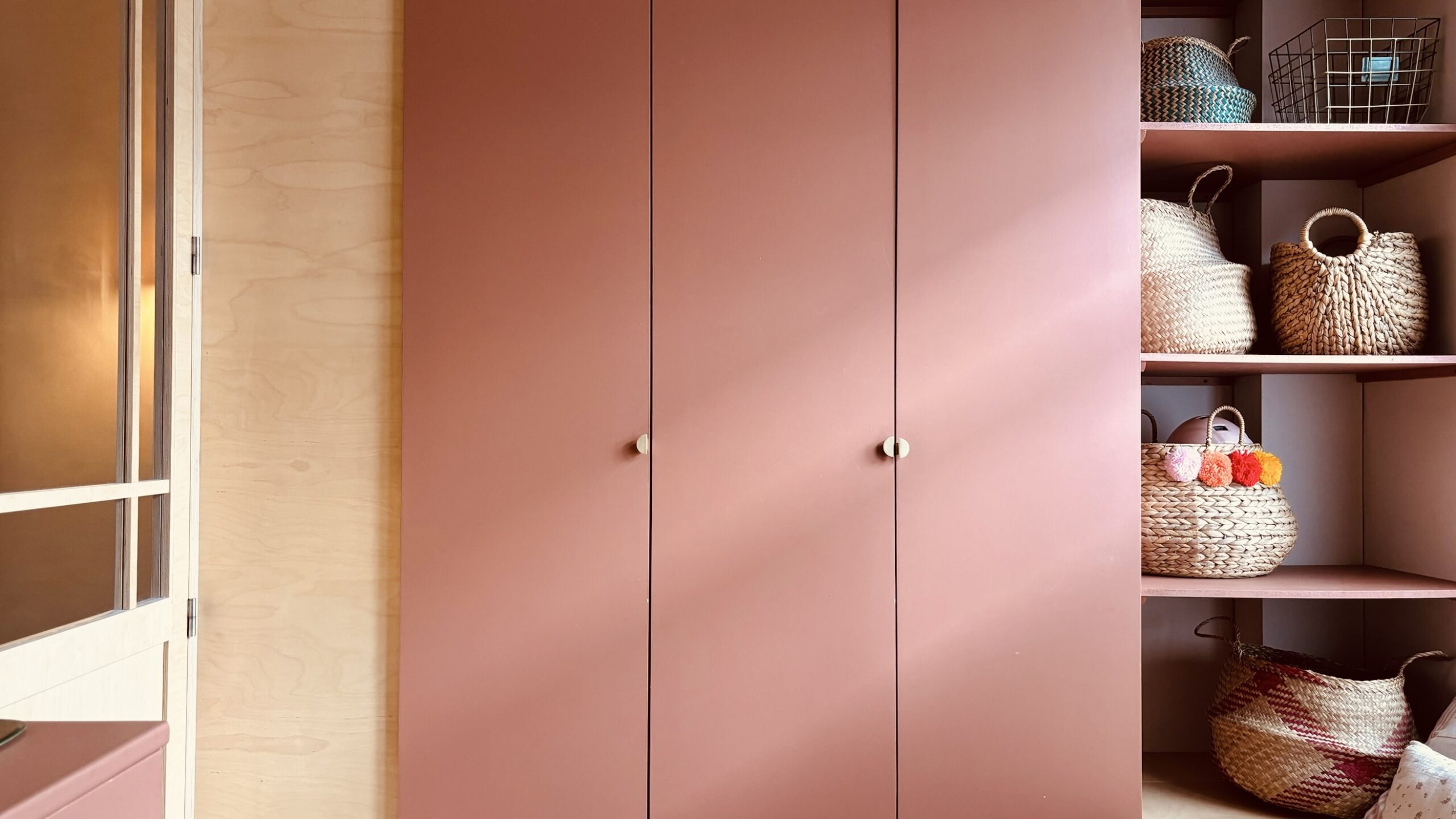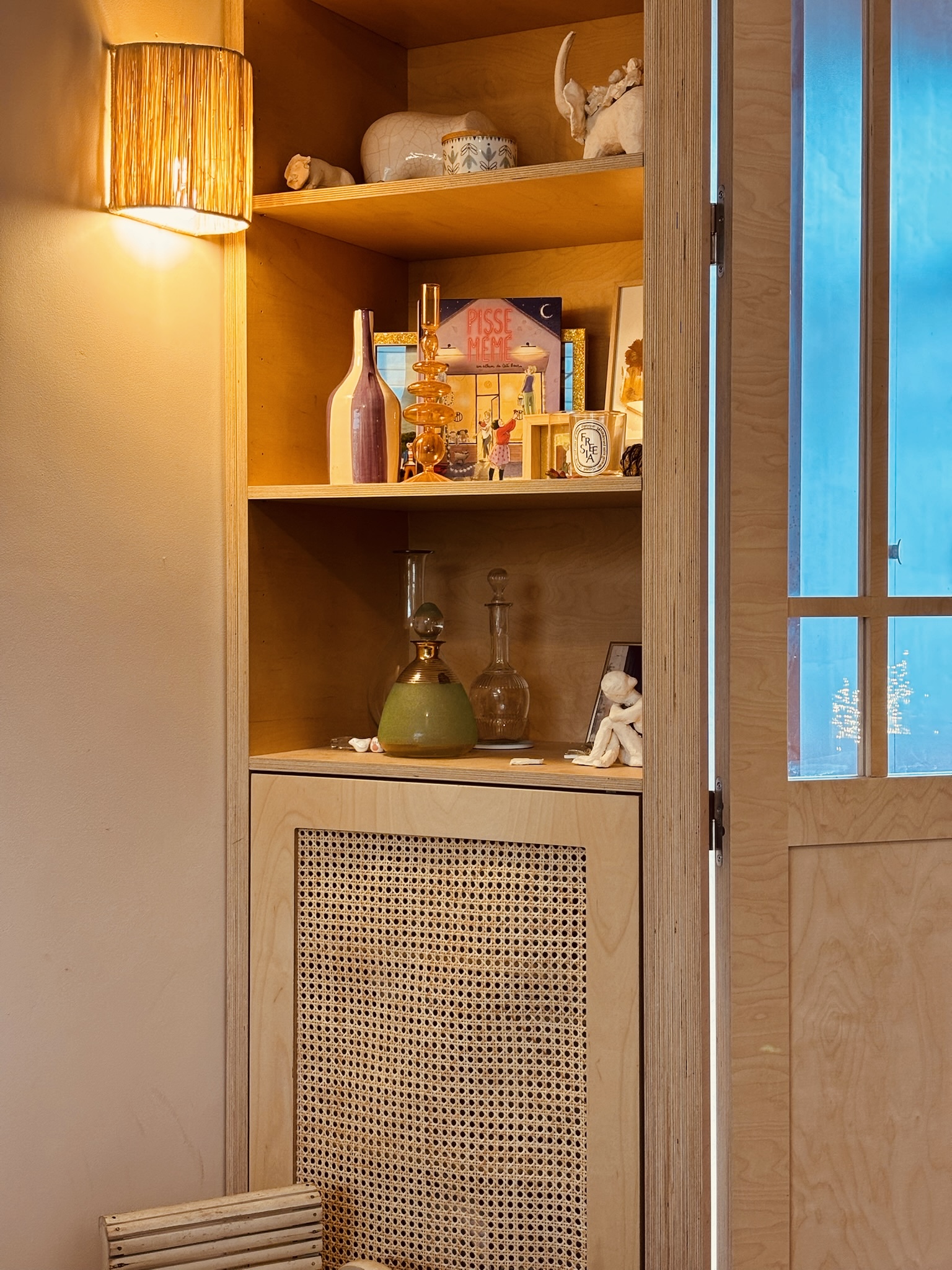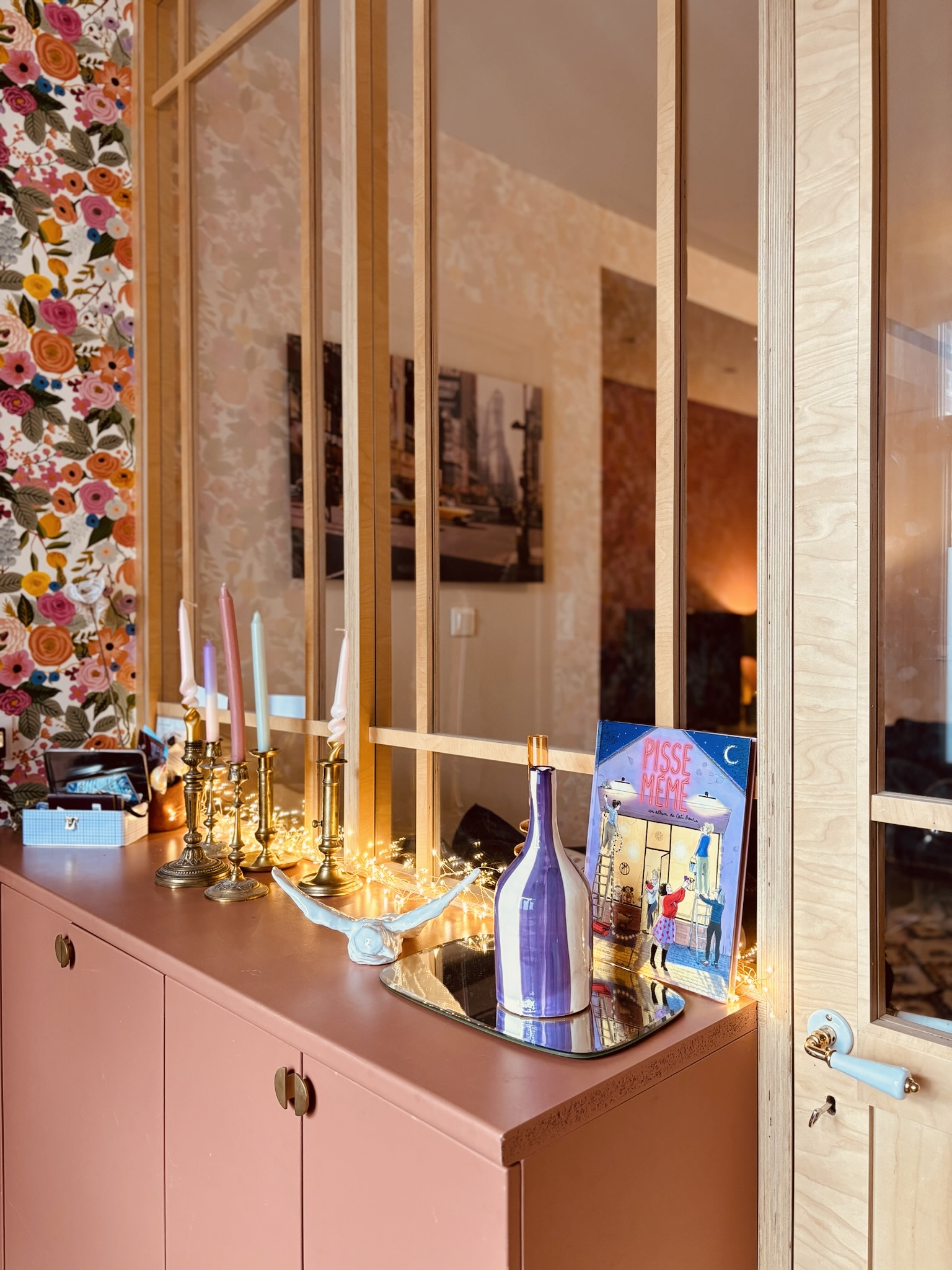 Côté déco, l’ambiance colorée est assumée pour faire de ce petit espace un écrin. La couleur Terracotta qui habille les placards est rehaussée par un papier peint fleuri, le tout adouci par la teinte lumineuse du contreplaqué de bouleau choisi pour la verrière.