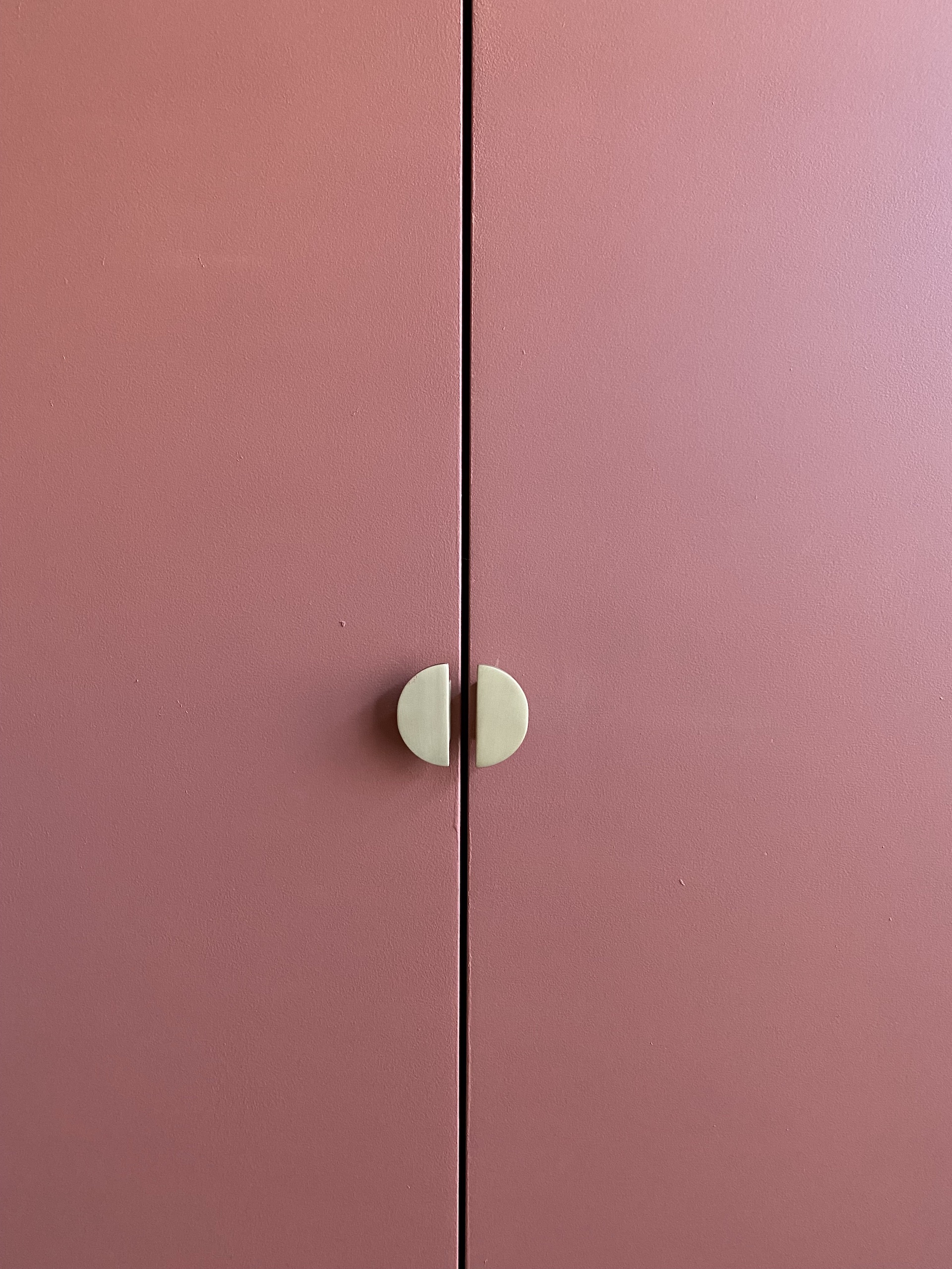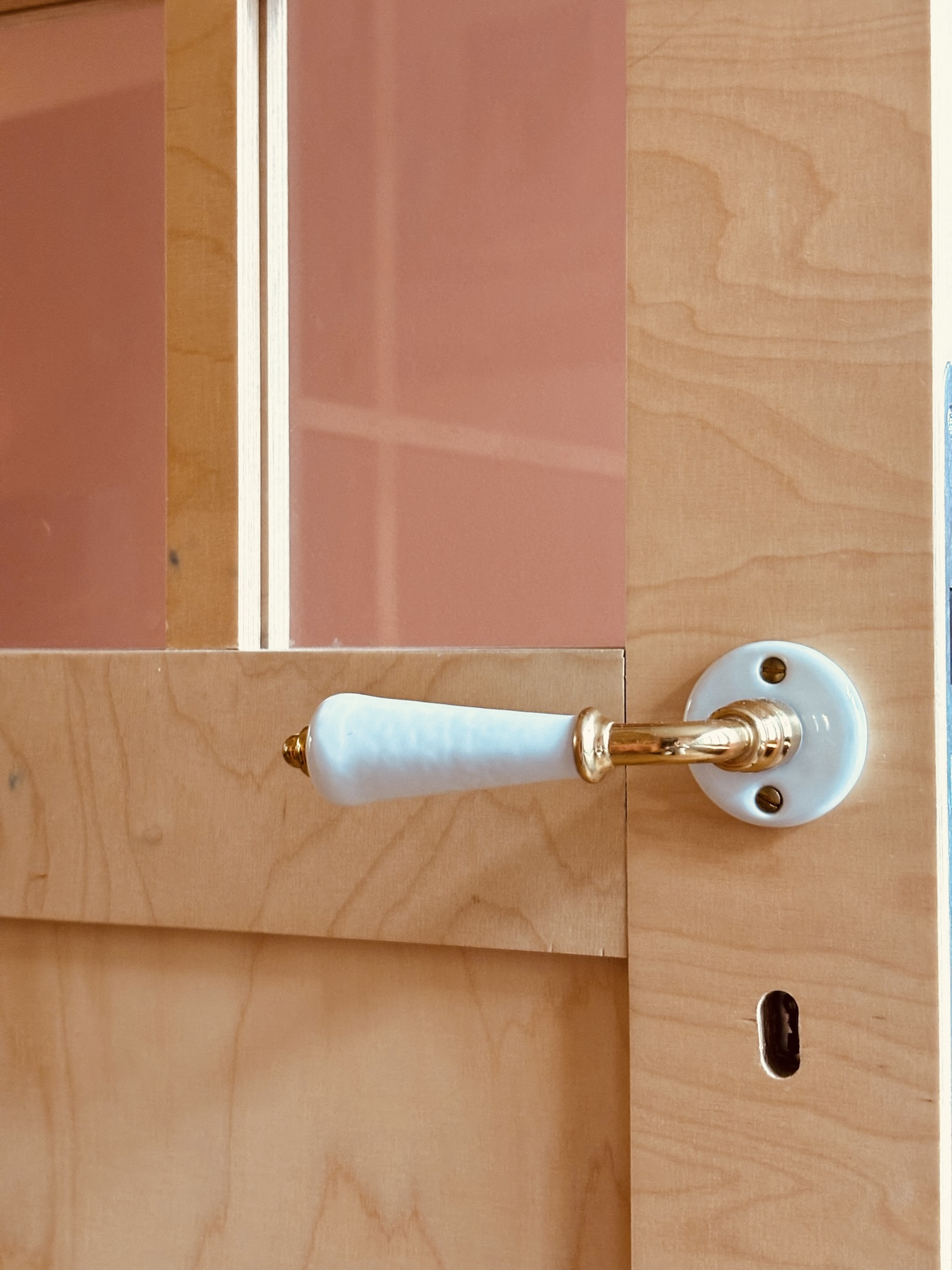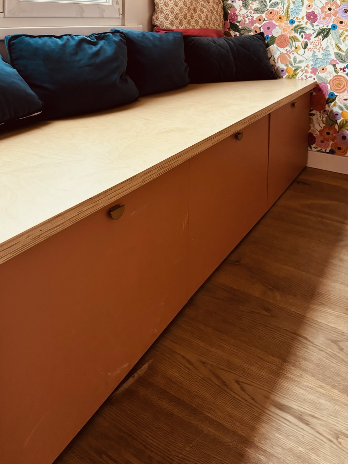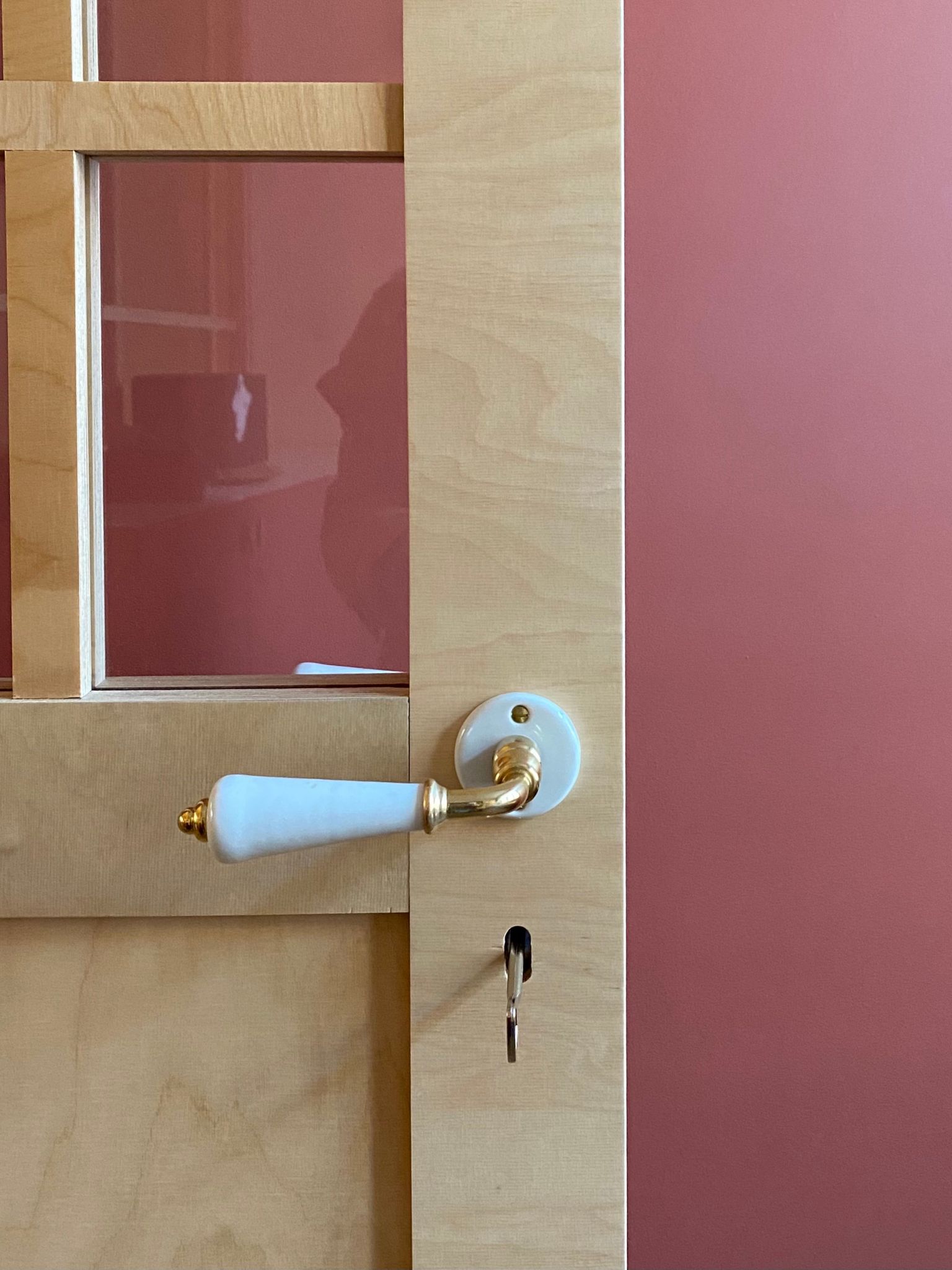 Côté déco, l’ambiance colorée est assumée pour faire de ce petit espace un écrin. La couleur Terracotta qui habille les placards est rehaussée par un papier peint fleuri, le tout adouci par la teinte lumineuse du contreplaqué de bouleau choisi pour la verrière.