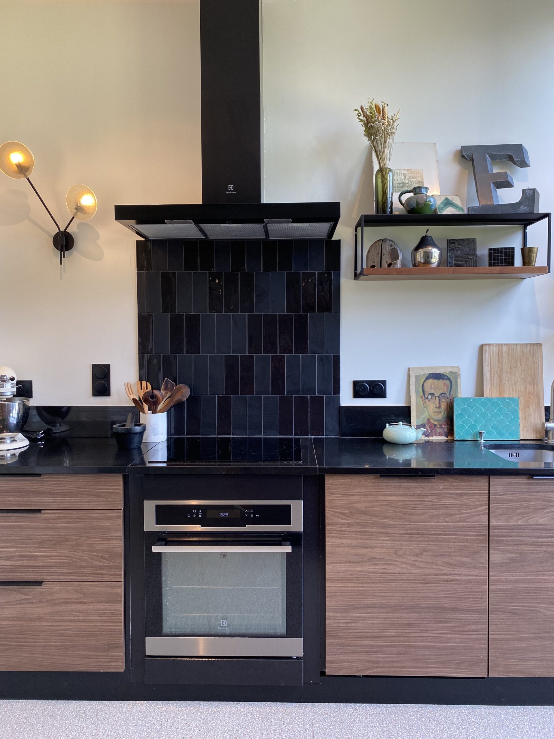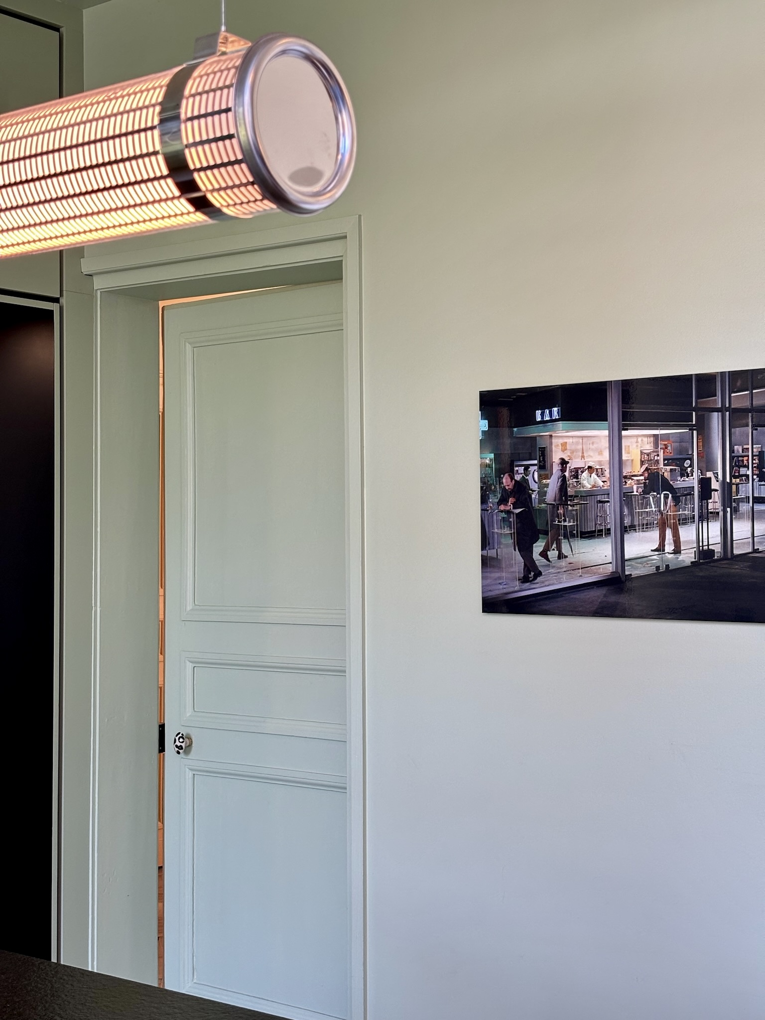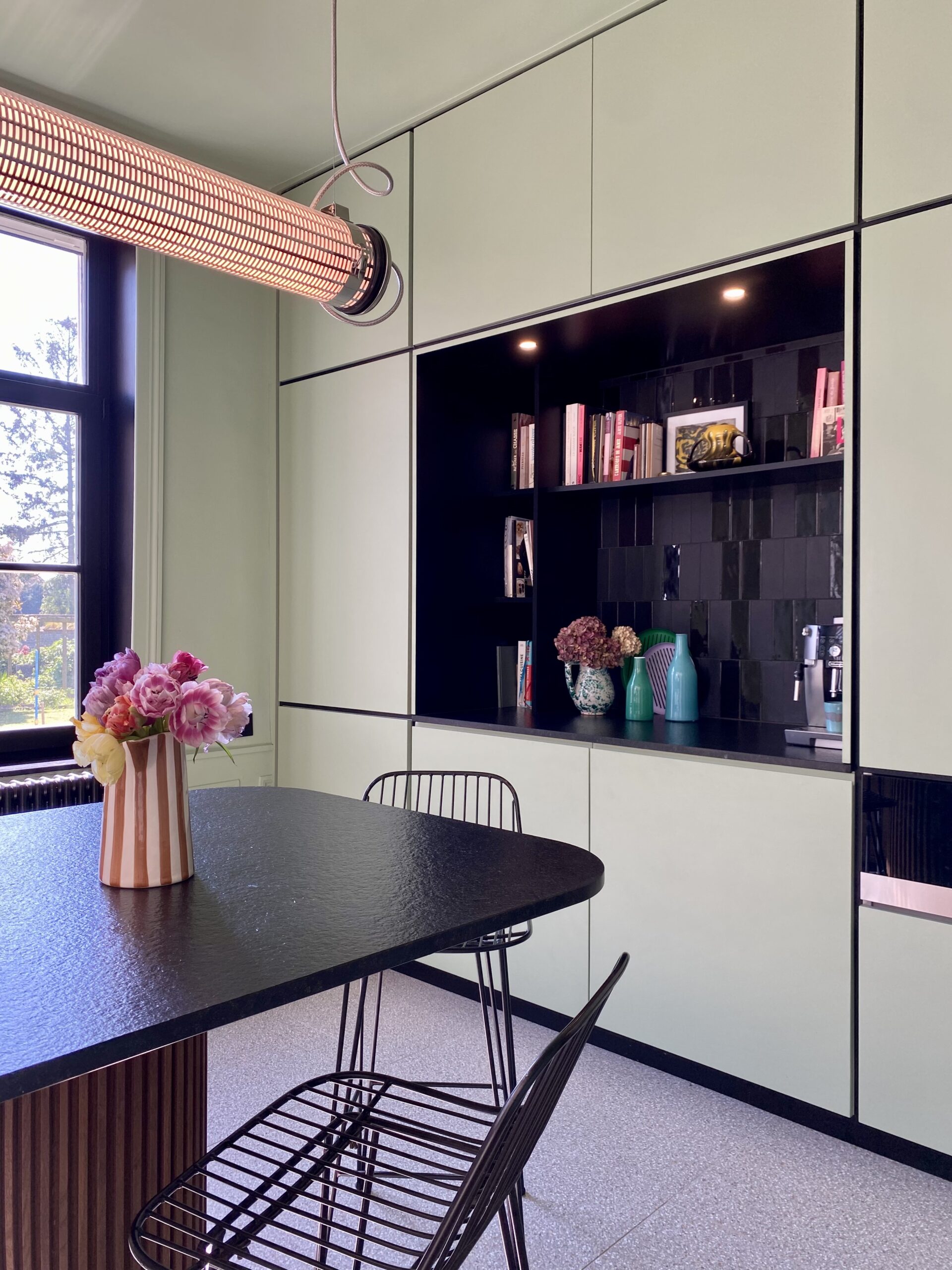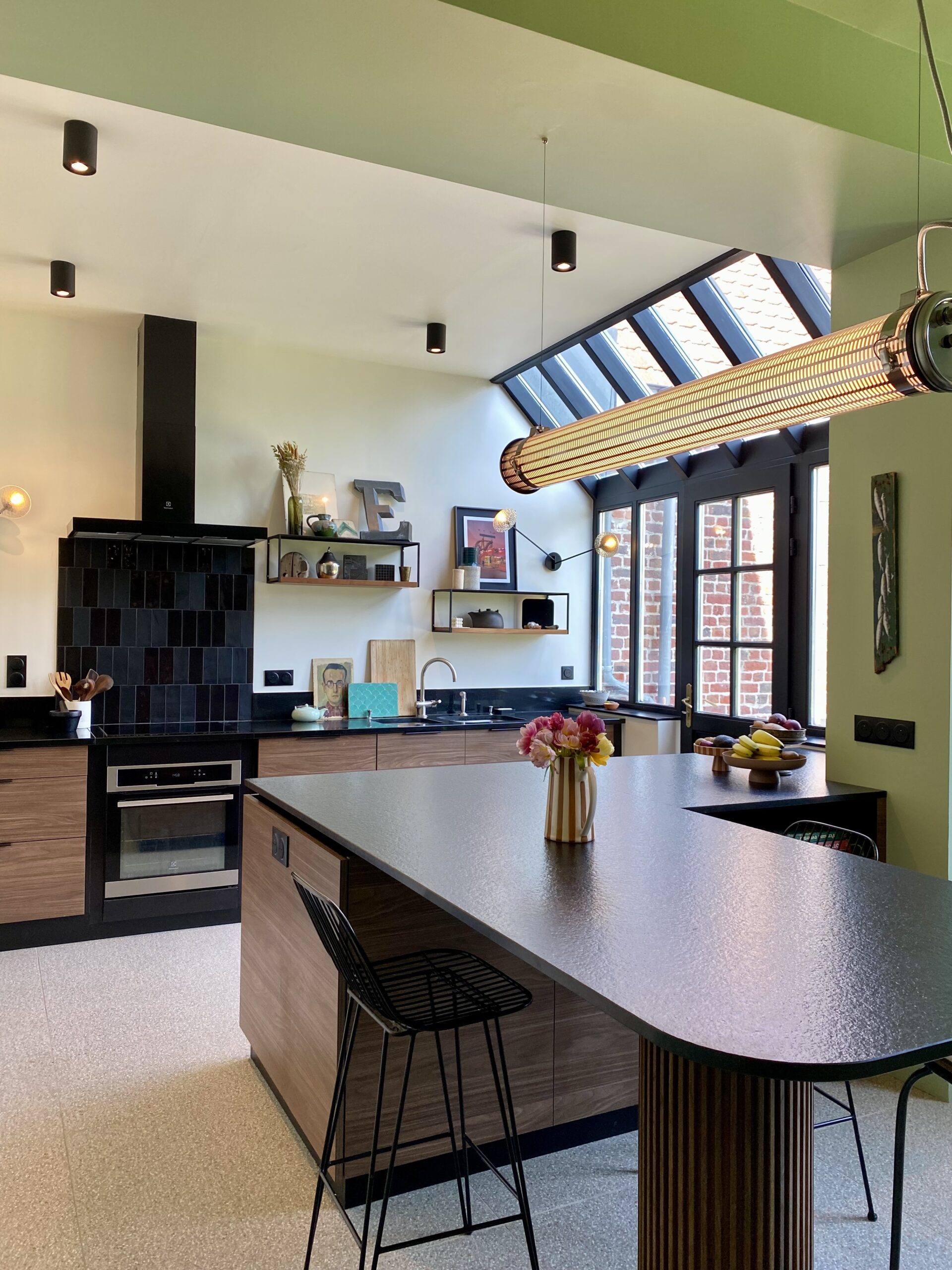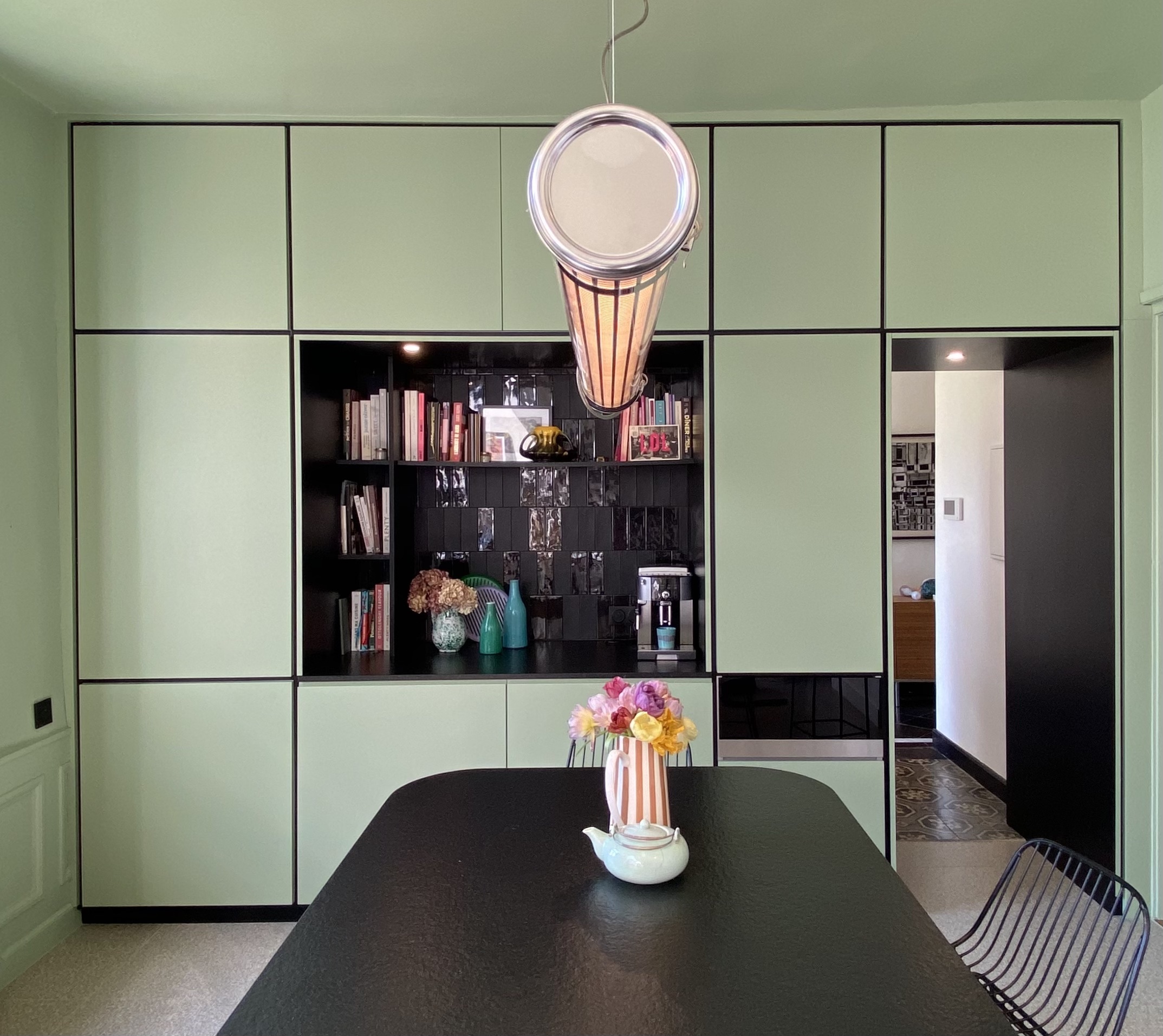 Côté décoration, l’inspiration est venue d’un tableau des clients, une photographie d’inspiration Edward Hopper, évoquant l’Amérique des diners. Ce tableau a guidé le choix d’une palette de verts et des luminaires, que nous avons mariés à des éléments noirs (plan de travail, détails de mobilier) et au bois de noyer. Le choix des matériaux et de l’ambiance a été pensé pour conjuguer éléments existants (comme le plan de travail en granit noir et les verrières atelier) et nouveaux matériaux (vert des murs, noyer & carrelage terrazzo). Pour les couleurs, nous avons opté pour deux ambiances distinctes : un blanc crème pour la zone cuisine sous la verrière, et un vert profond pour l’espace repas, créant un effet de boîte immersive jusqu’au plafond.
