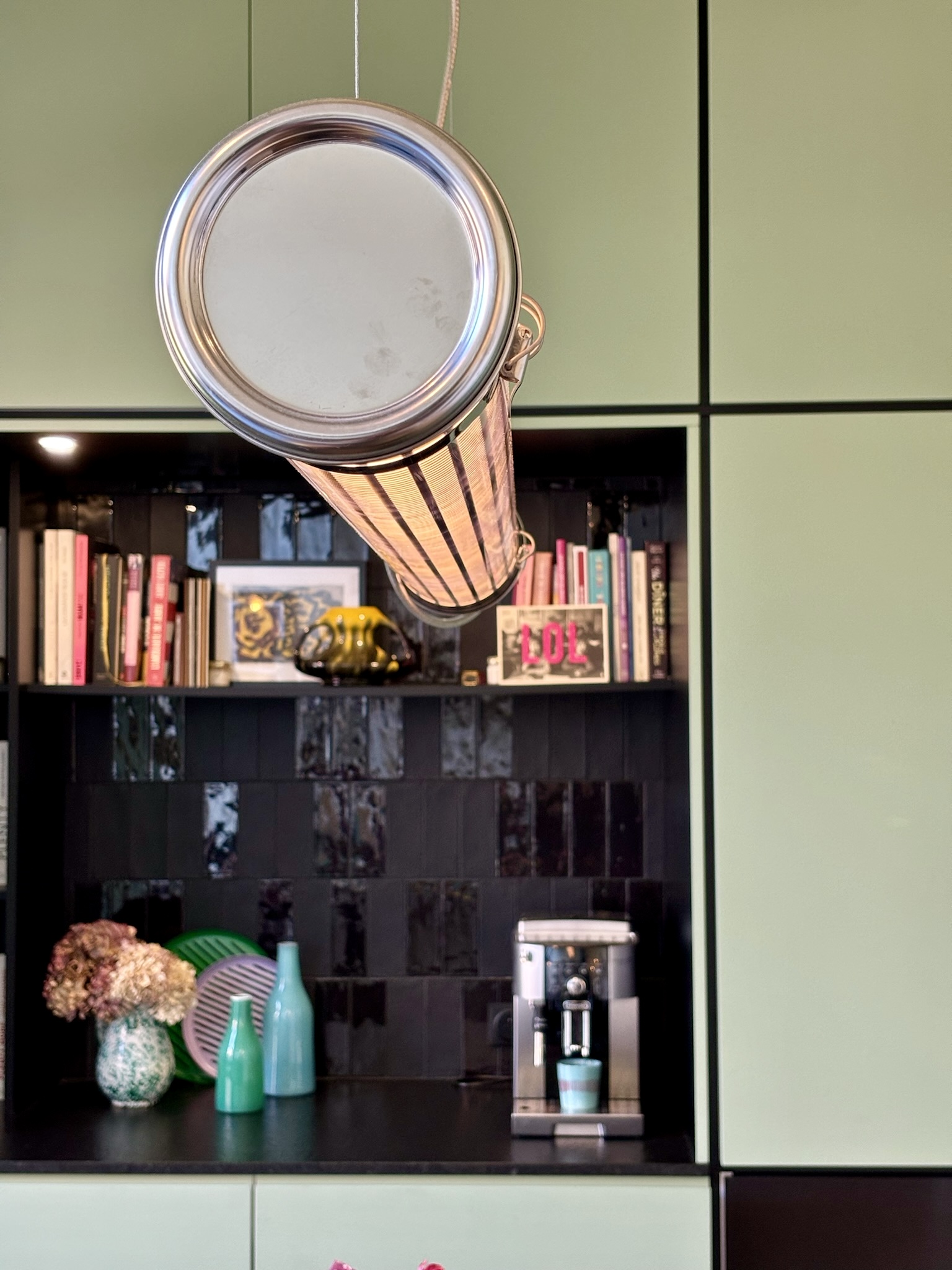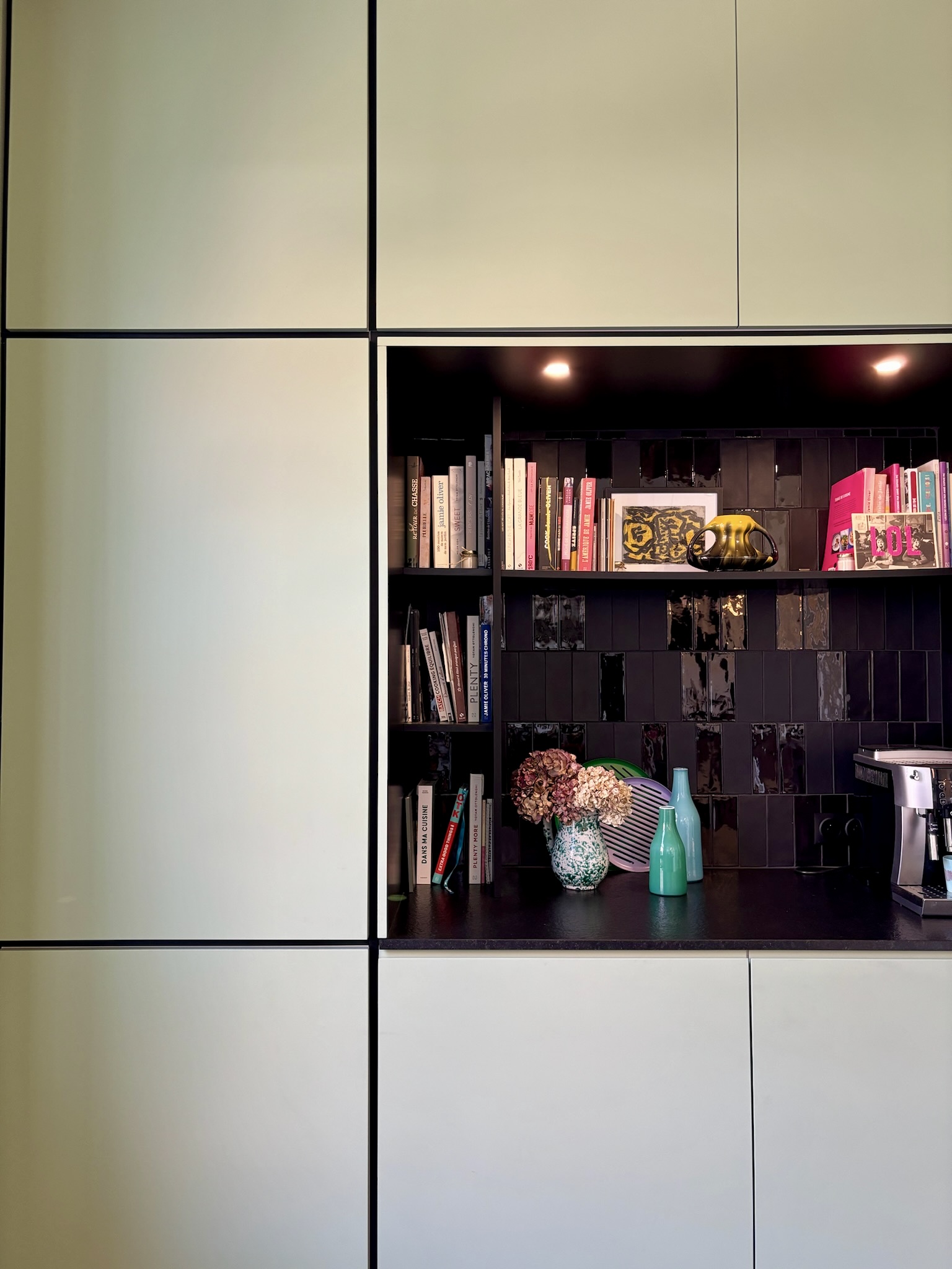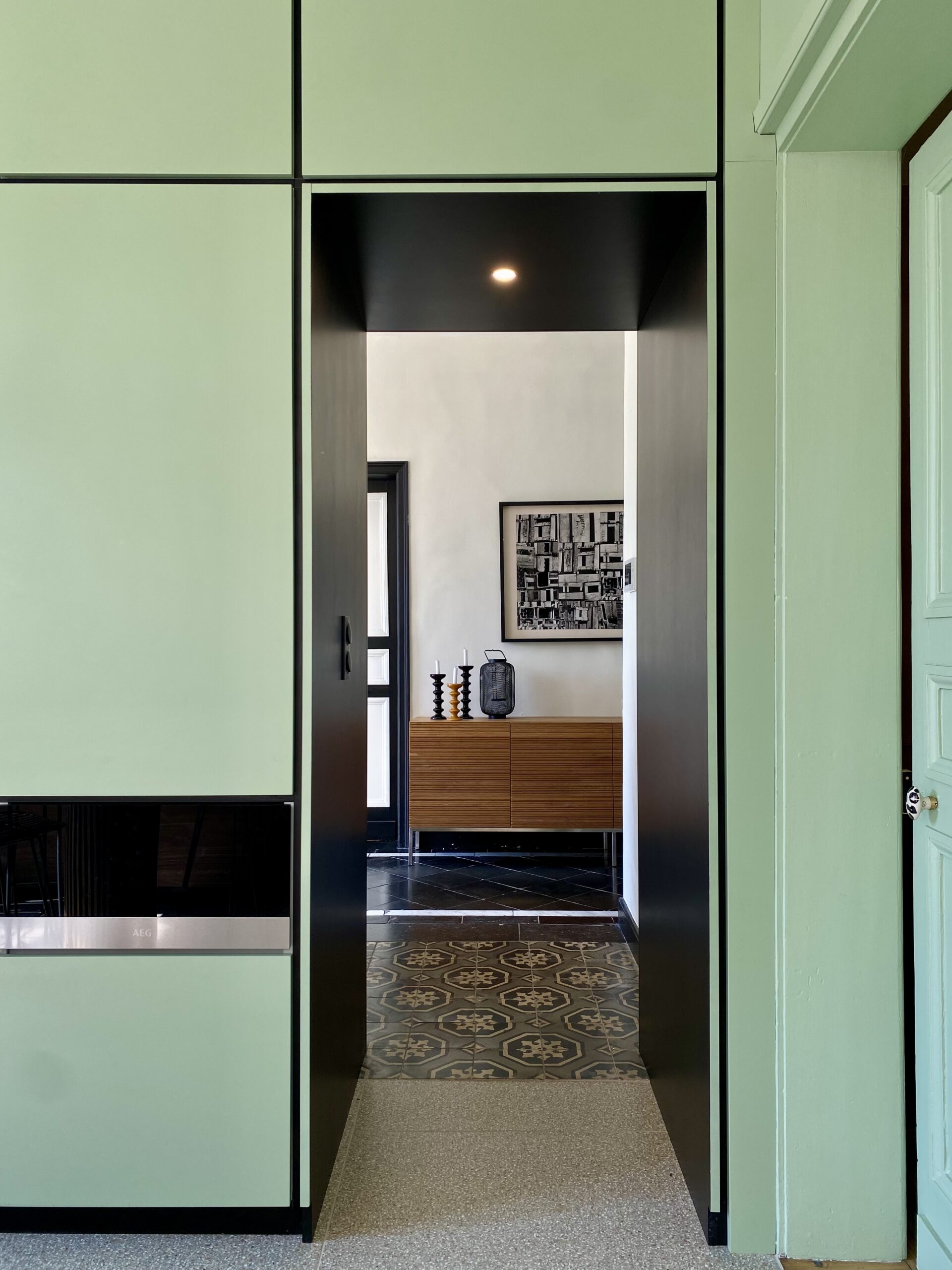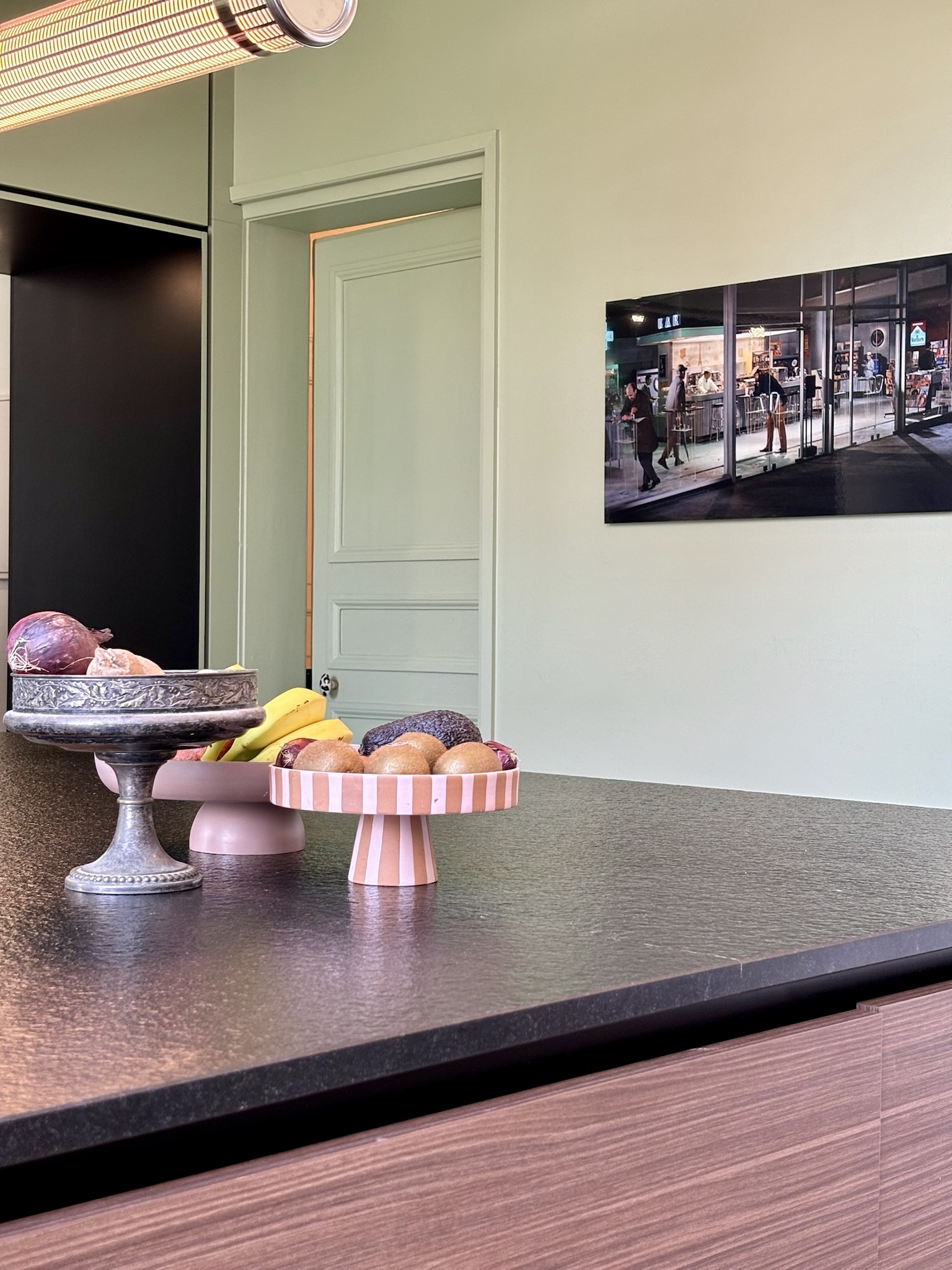 Côté décoration, l’inspiration est venue d’un tableau des clients, une photographie d’inspiration Edward Hopper, évoquant l’Amérique des diners. Ce tableau a guidé le choix d’une palette de verts et des luminaires, que nous avons mariés à des éléments noirs (plan de travail, détails de mobilier) et au bois de noyer. Le choix des matériaux et de l’ambiance a été pensé pour conjuguer éléments existants (comme le plan de travail en granit noir et les verrières atelier) et nouveaux matériaux (vert des murs, noyer & carrelage terrazzo). Pour les couleurs, nous avons opté pour deux ambiances distinctes : un blanc crème pour la zone cuisine sous la verrière, et un vert profond pour l’espace repas, créant un effet de boîte immersive jusqu’au plafond.