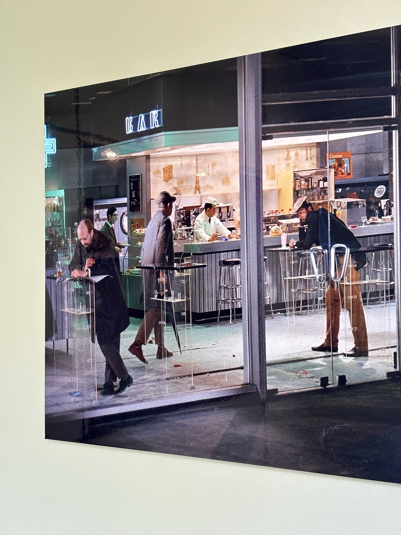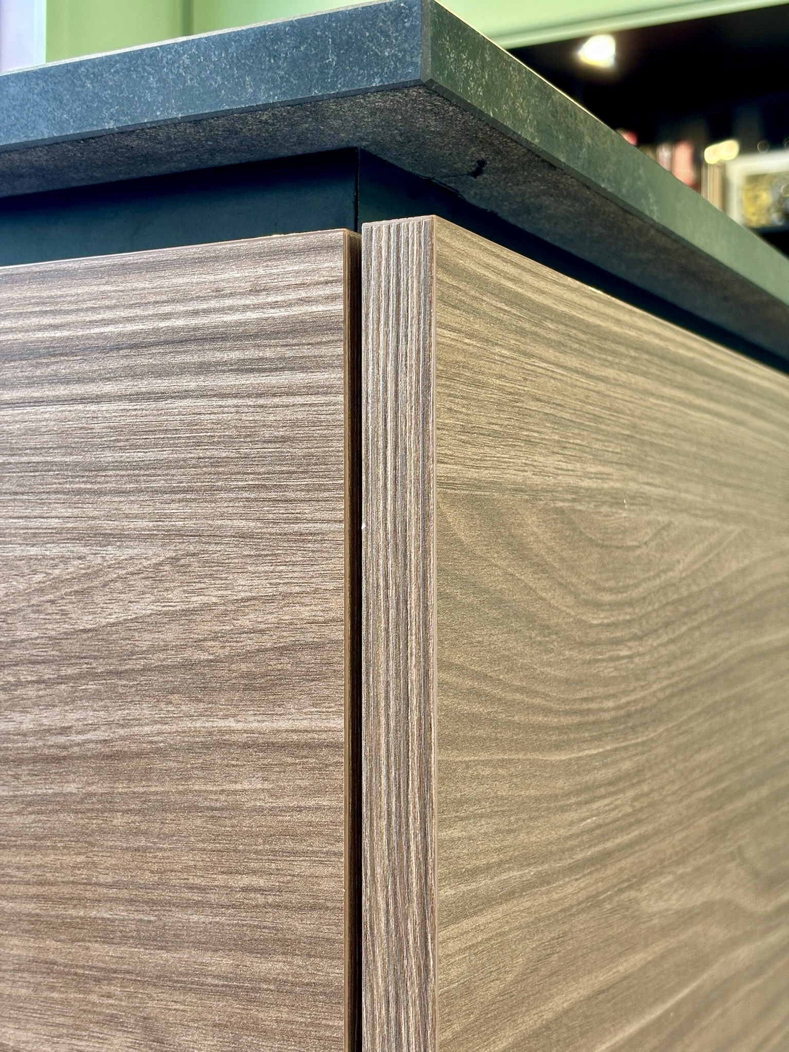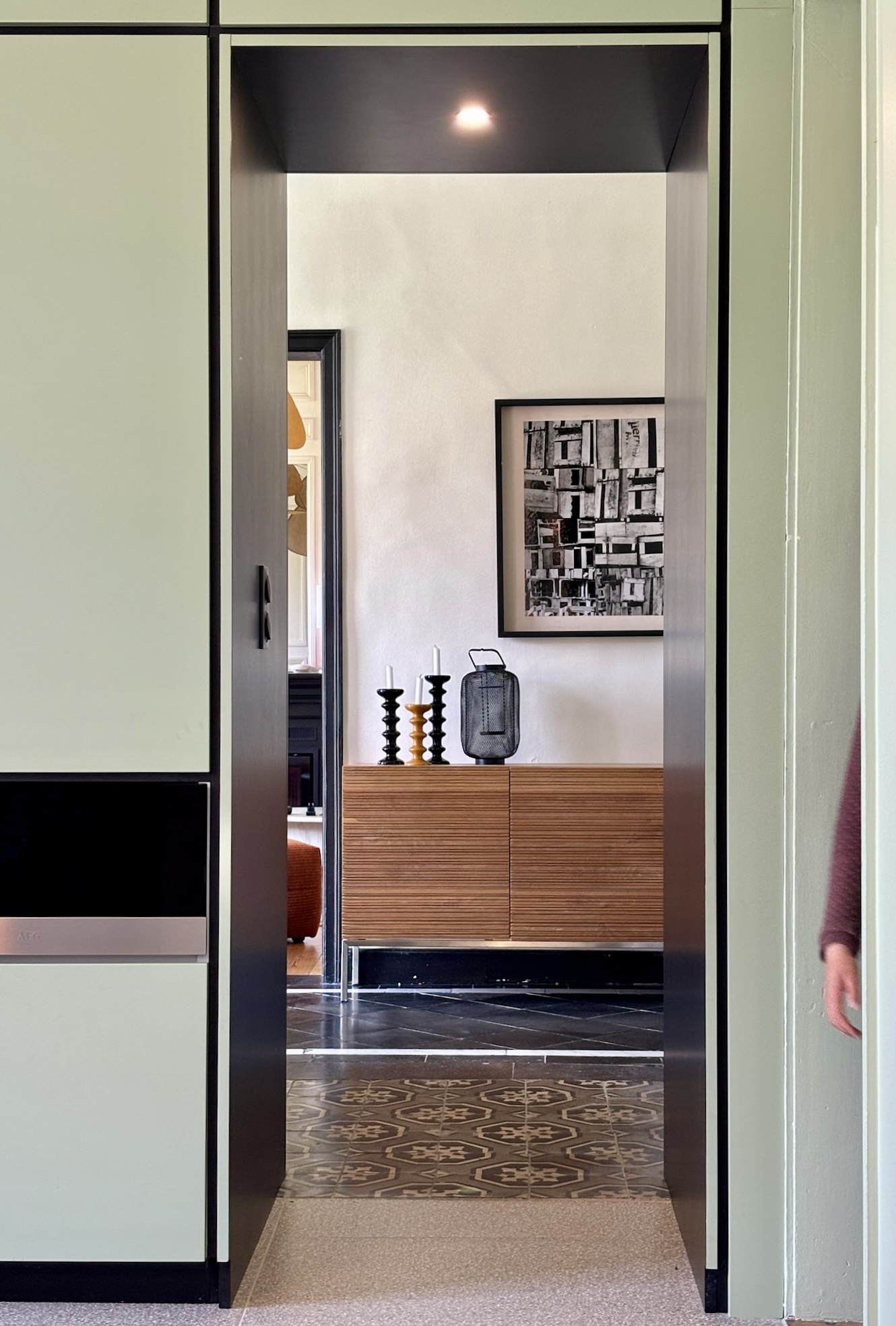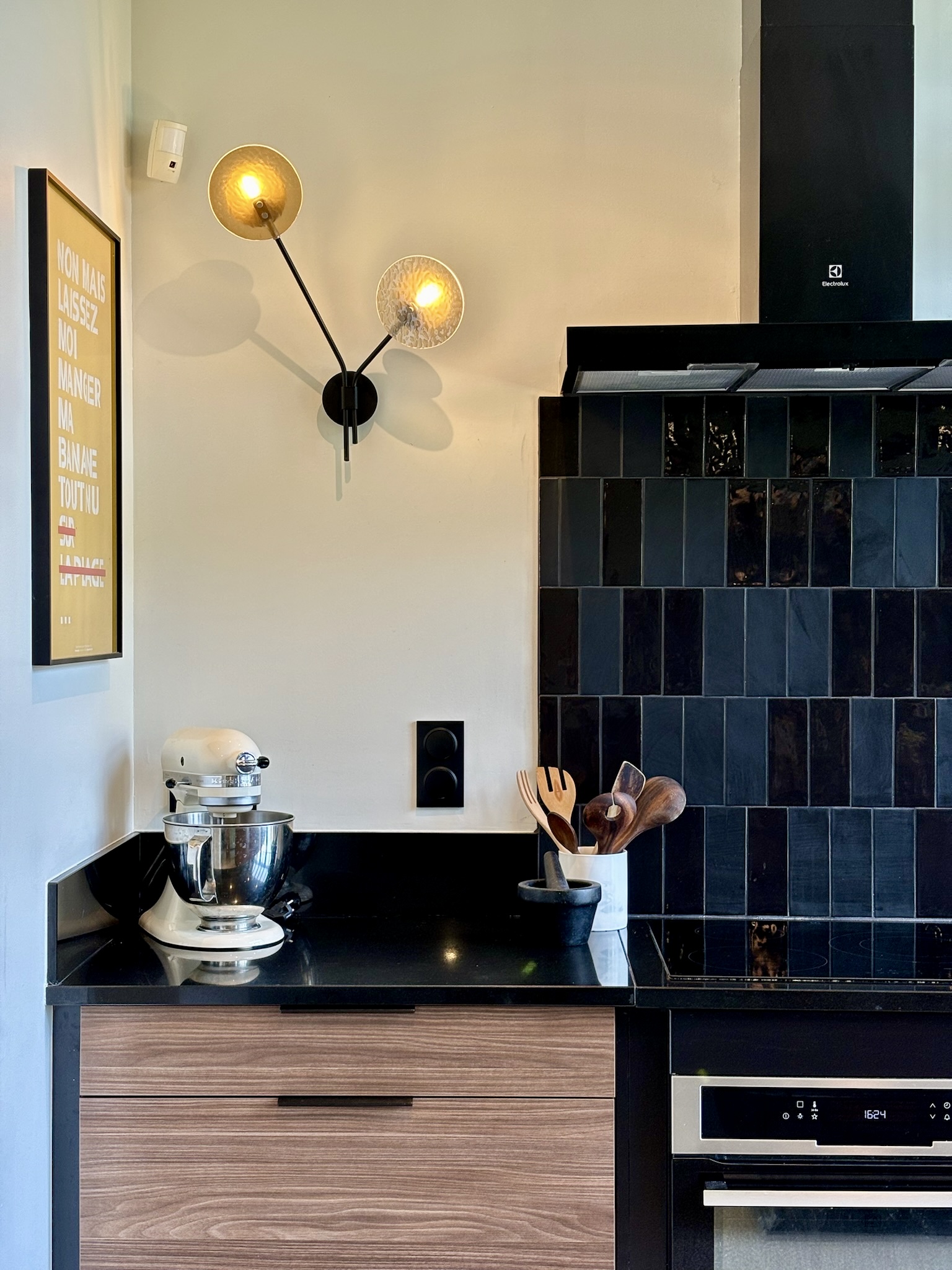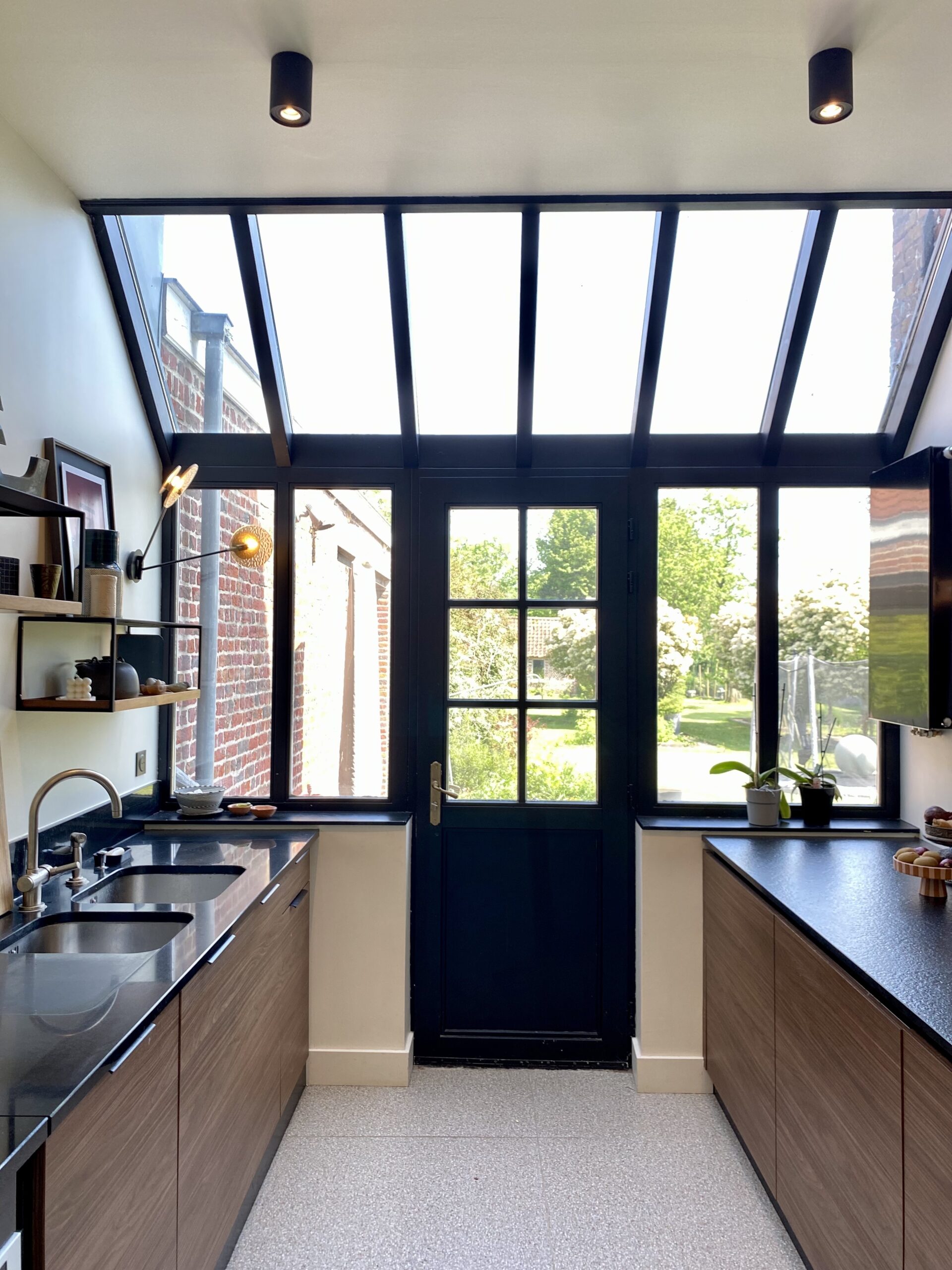 Côté décoration, l’inspiration est venue d’un tableau des clients, une photographie d’inspiration Edward Hopper, évoquant l’Amérique des diners. Ce tableau a guidé le choix d’une palette de verts et des luminaires, que nous avons mariés à des éléments noirs (plan de travail, détails de mobilier) et au bois de noyer. Le choix des matériaux et de l’ambiance a été pensé pour conjuguer éléments existants (comme le plan de travail en granit noir et les verrières atelier) et nouveaux matériaux (vert des murs, noyer & carrelage terrazzo). Pour les couleurs, nous avons opté pour deux ambiances distinctes : un blanc crème pour la zone cuisine sous la verrière, et un vert profond pour l’espace repas, créant un effet de boîte immersive jusqu’au plafond.
